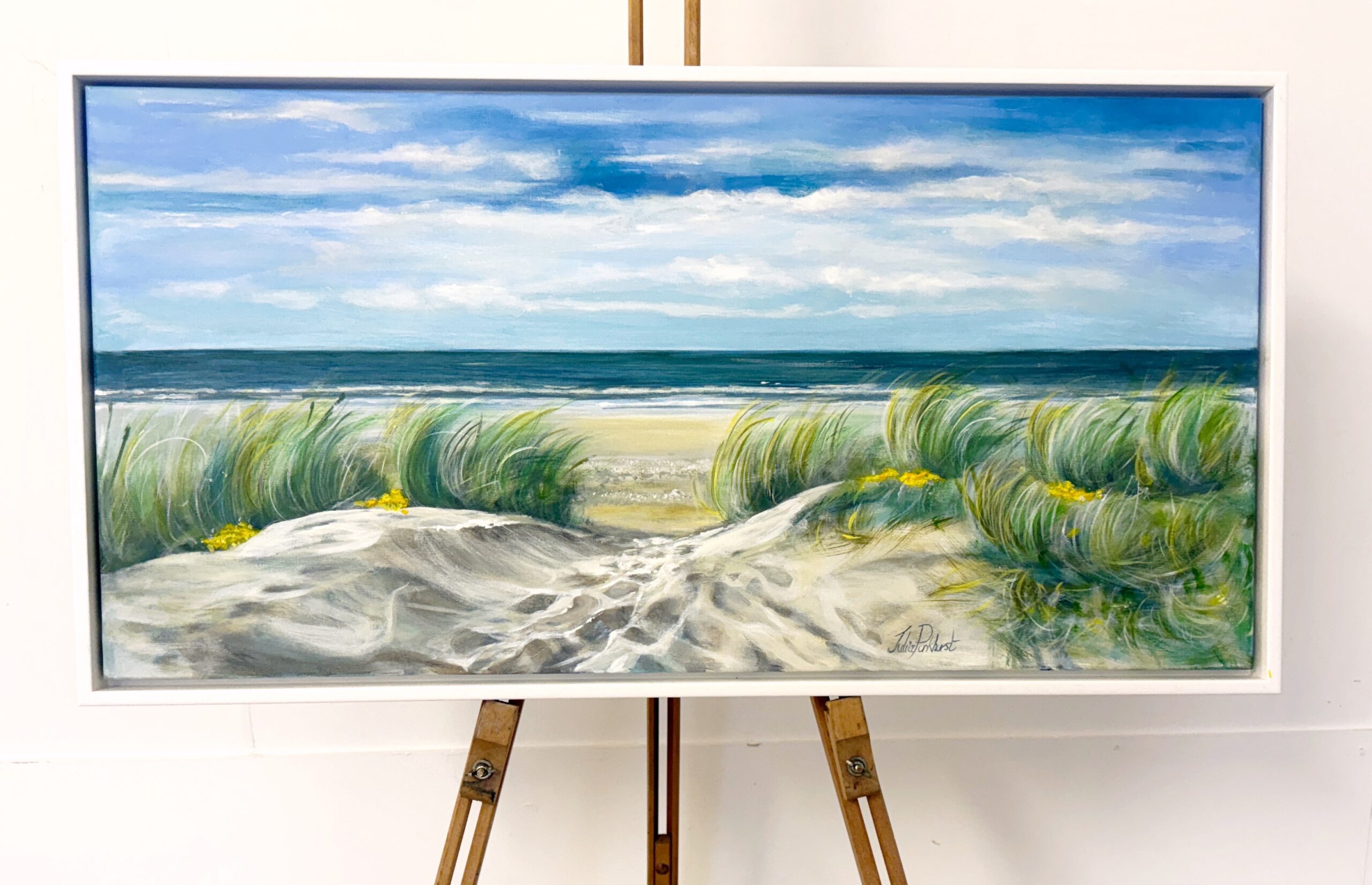 Cornish beach scene of Soft sand dunes and grasses blowing in the wind.  Like many other beach scenes of Julia’s this one once again draws in the viewer so that you can almost feel the warm sand between your toes.