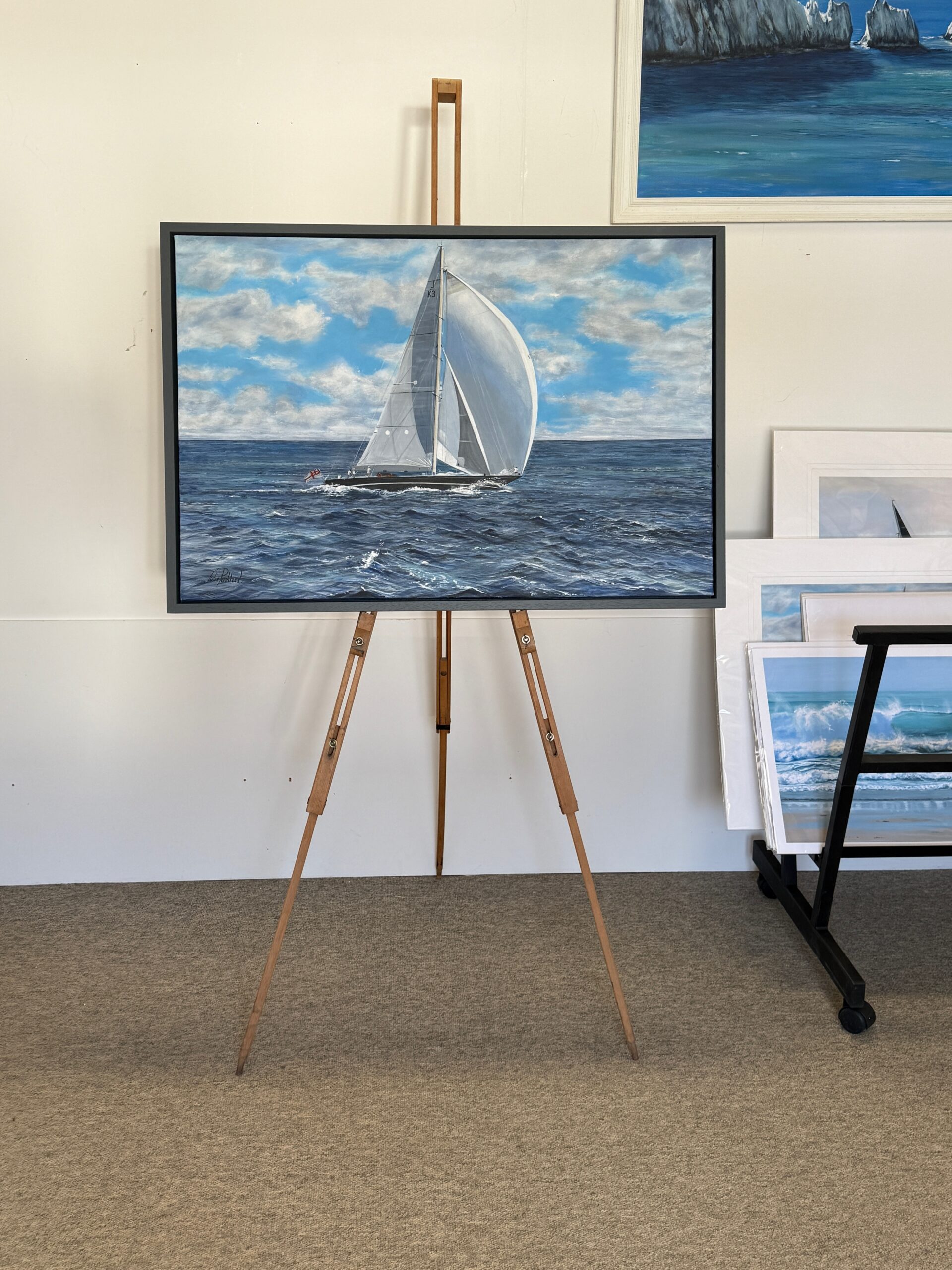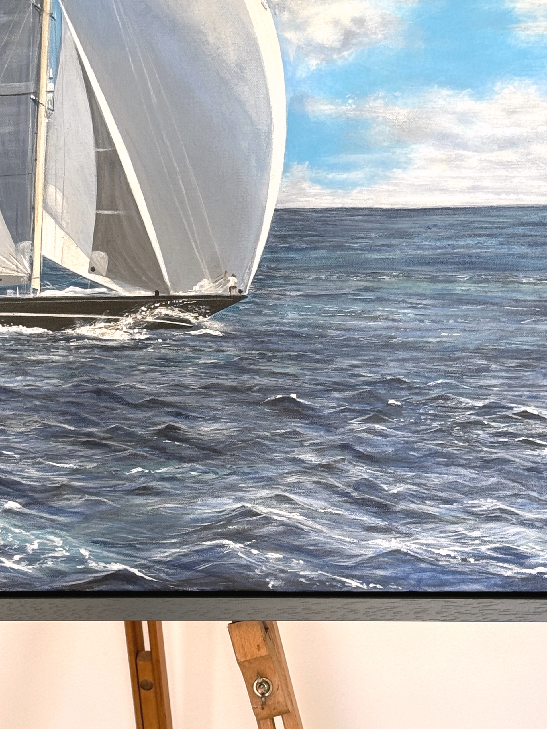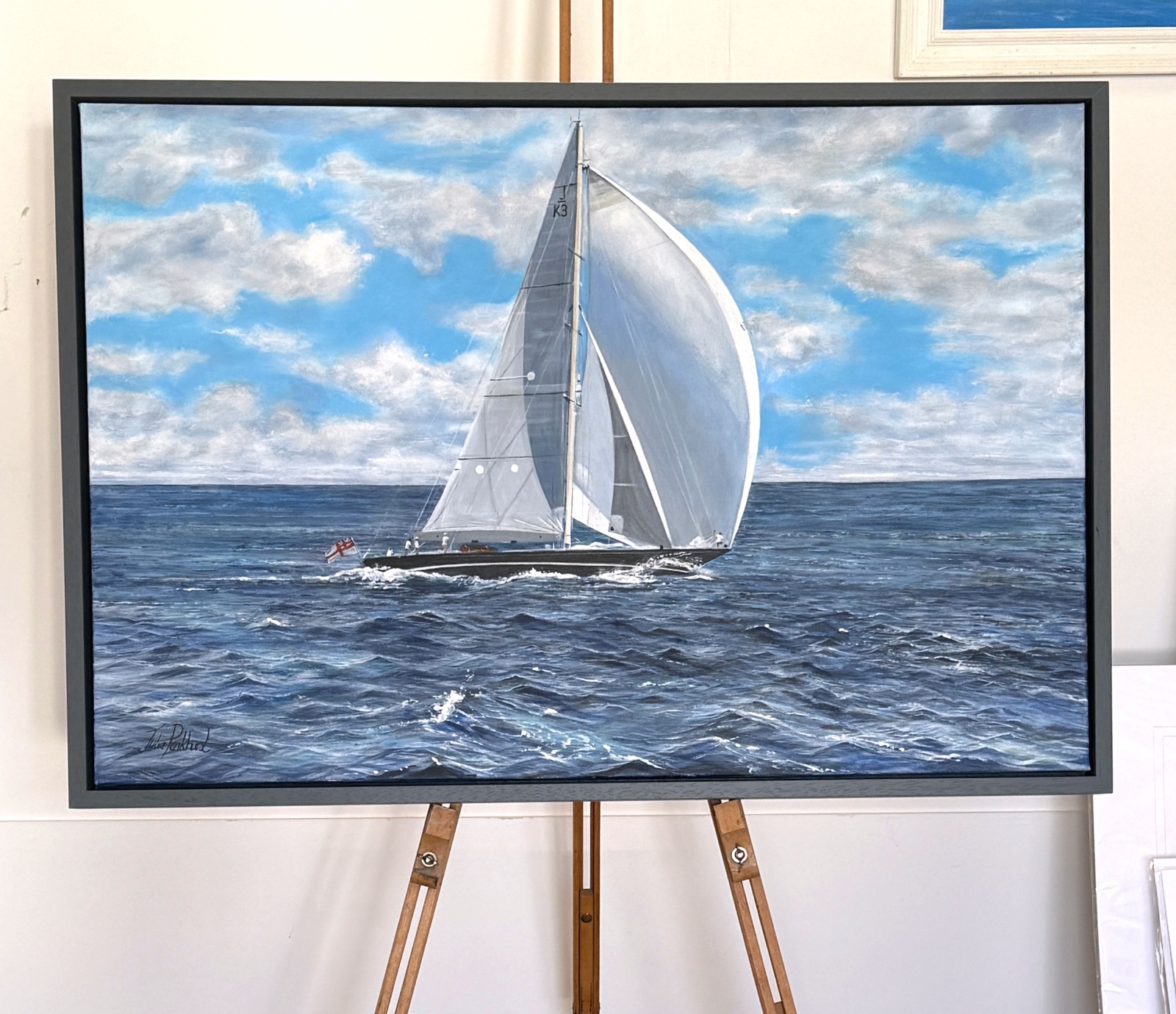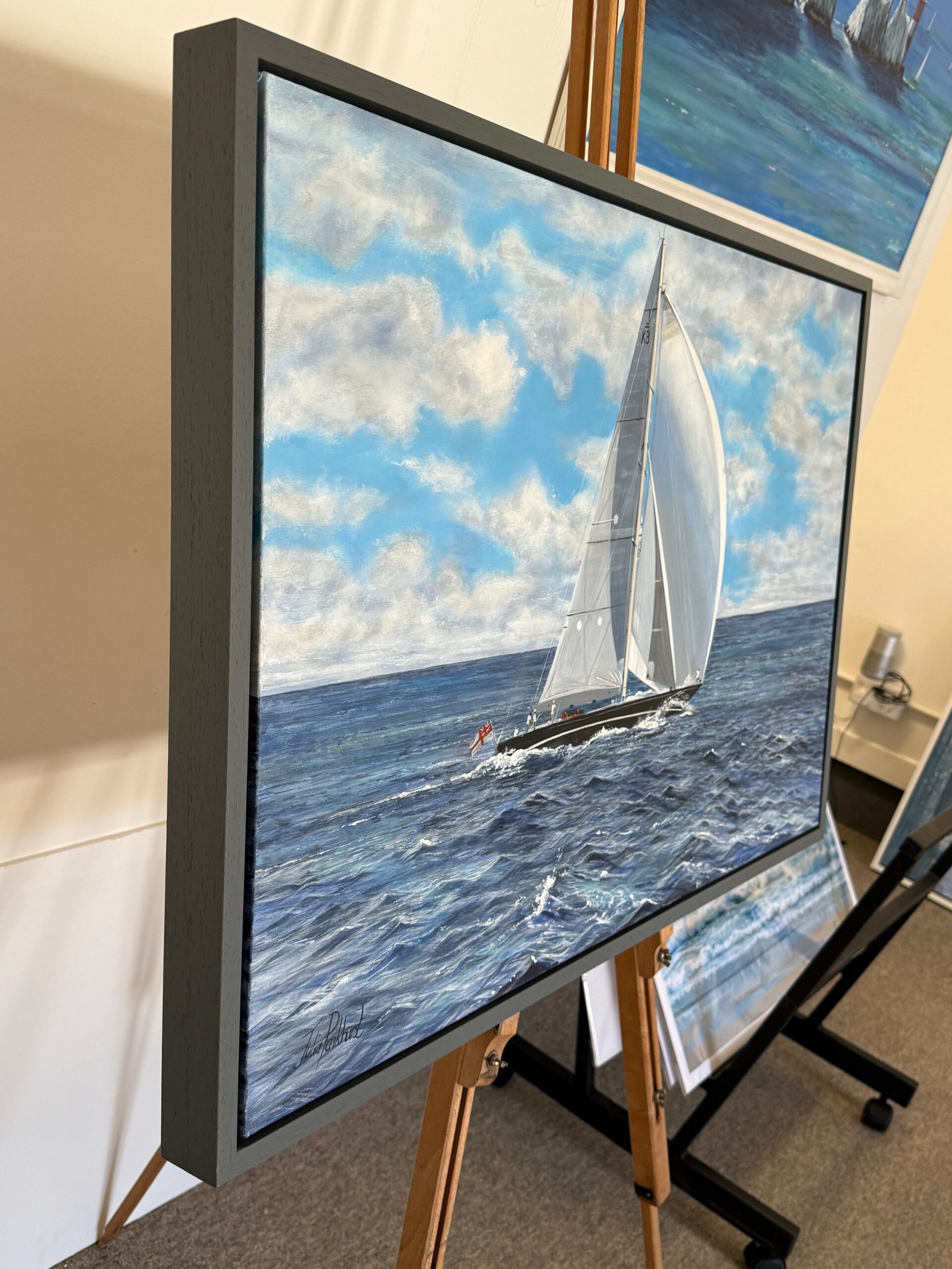 SHAMROCK V – ‘QUEEN OF THE J CLASS’ The Legend returns back to the sea Acrylic painting on canvas in a dark grey floating frame 95 x 65cm (100 limited Edition prints).